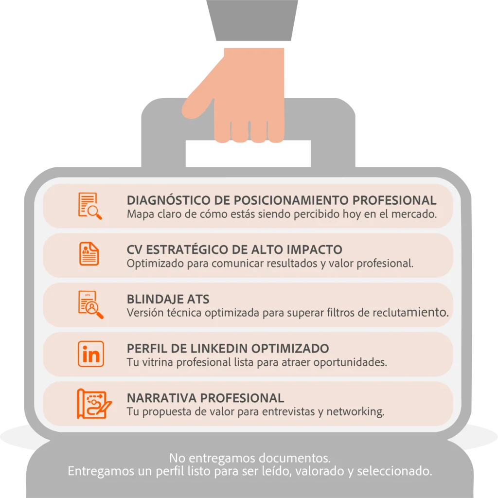 No inventamos contenido: todo el perfil se construye a partir de tu experiencia real, bien articulada y estratégicamente presentada.