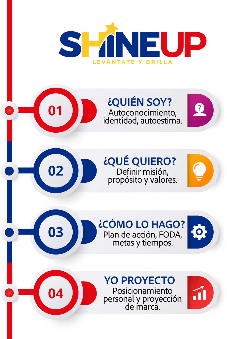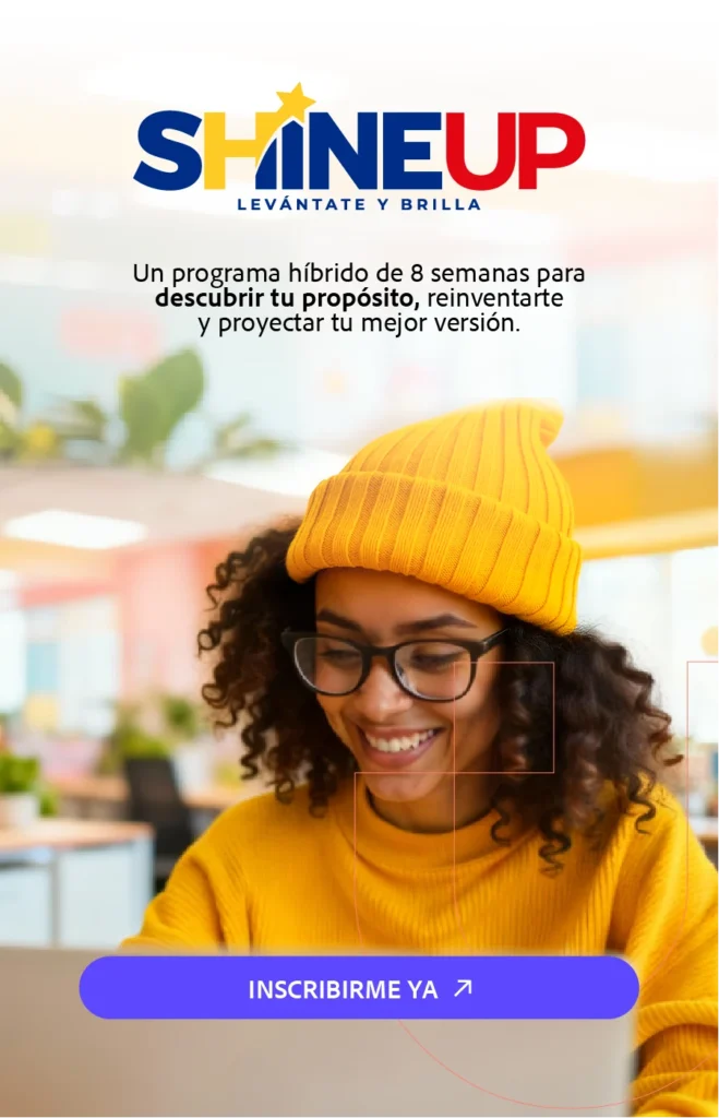 SHINE UP es un programa de transformación personal y profesional que te ayudará a descubrir tu identidad, propósito y competencias, para diseñar un plan de vida y proyectar tu nuevo YO con claridad y seguridad.